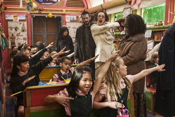 Midway through their journey, the tail-sectioners walk in on an elementary school class, where we finally learn the origin of the train. The brainchild of an eccentric billionaire survivalist, the “rattling ark”’s history is revealed to us in a bombastic propaganda newsreel straight out of Starship Troopers and the darkest reaches of North Korea. The teacher is a perky-blond gog-eyed grotesque belched from the hellscape of Soundgarden’s music video for “Black Hole Sun” who leads her students in rah-rah call-and-repeat chants that extol the benevolence and genius of their fearless leader (the aforementioned Galt-Wonka hybrid played by Ed Harris) and recall the conformist mania of any number of fascist regimes. (I also flashed on the wake-up calisthenics done in a lot of far-eastern nations.)